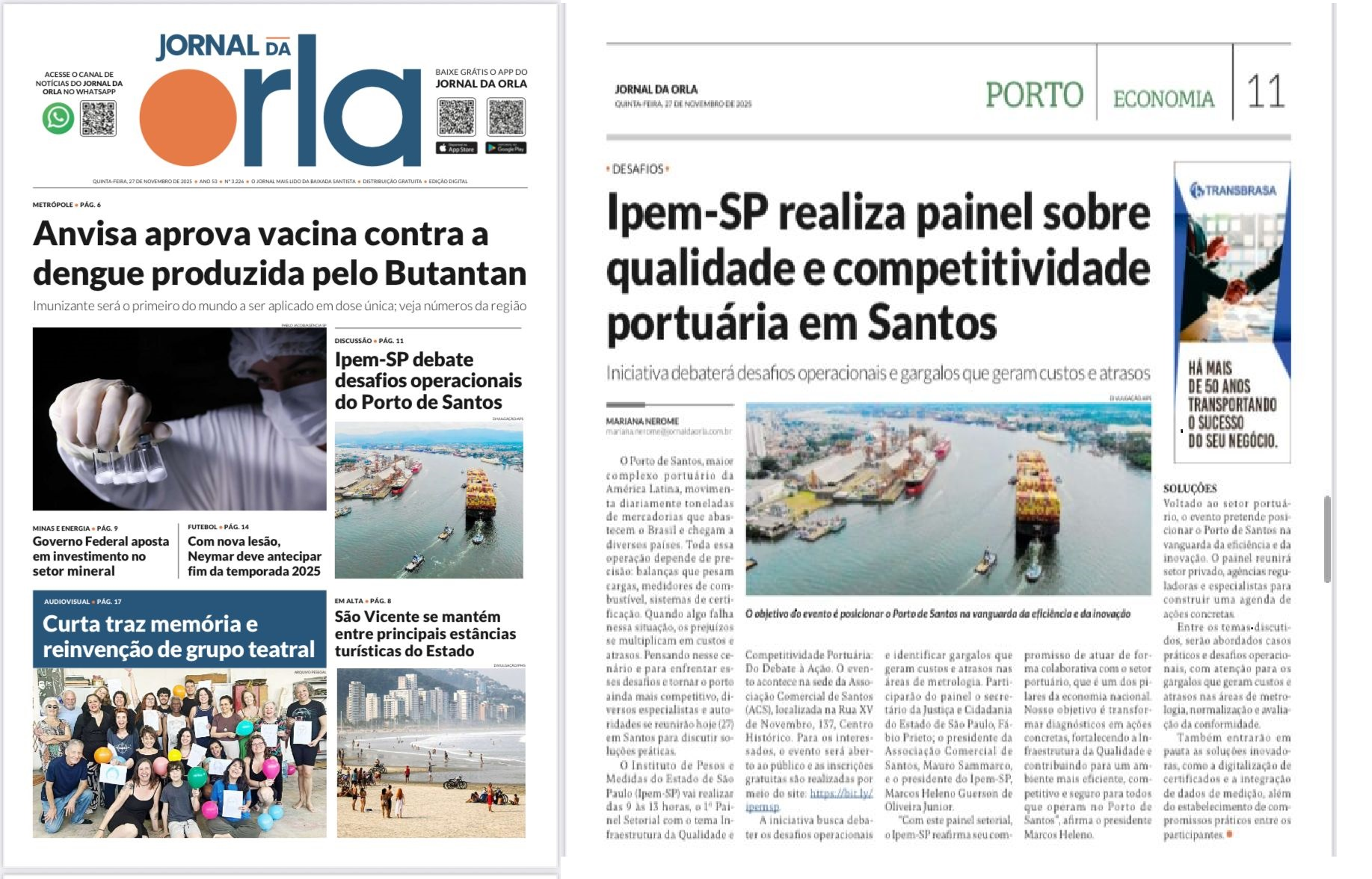 Ipem-SP realiza painel sobre qualidade e competitividade portuária em Santos, Jornal da Orla, 27/11/25